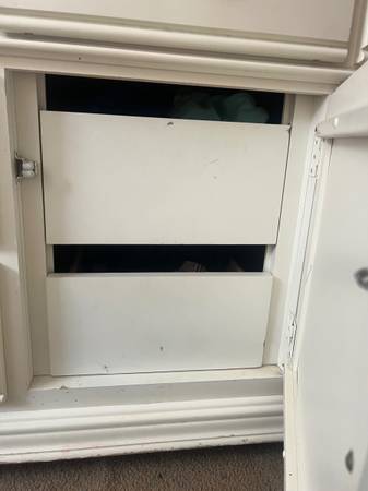 Broyhill, Off-White solid wood queen sized bedroom set, includes plastic covered mattress, box spring, headboard/footboard, dresser with mirror-7 drawers with a cabinet that has two enclosed drawers. Great for a flip or a personal refinishing project, I just don’t have the time and want to size down. Desk with two(2) drawers is free! Nothing’s wrong with the mirror just blocked a picture that’s hanging up across from it!
