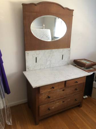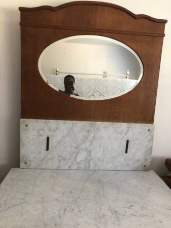 Vintage wooden dresser with marble top and attached mirror. German made. Depth 21in x height 30 x width 39.5 Height is 74 inches with mirror 4 drawers