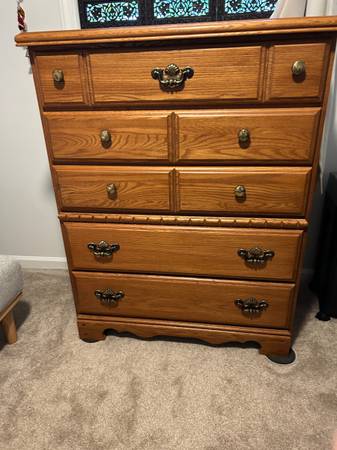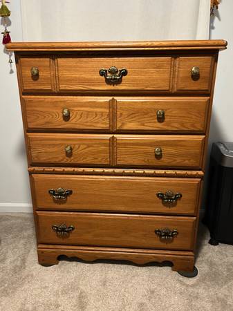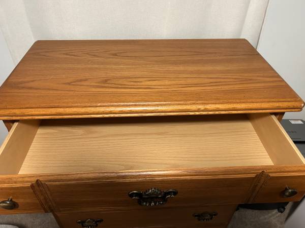 Simple, high dresser with five drawers. Used, but in very good condition. This is a solid piece, on the heavy side, and is made from solid oak for the top, sides and drawer fronts as well as oak veneers and pine used in the drawers. Brass finish hardware and handles.
