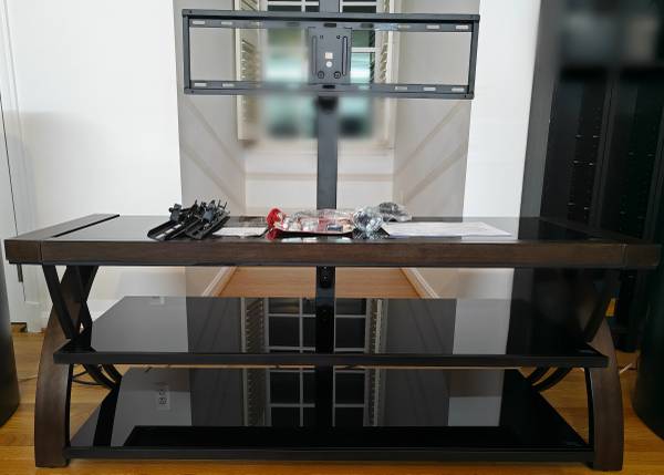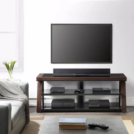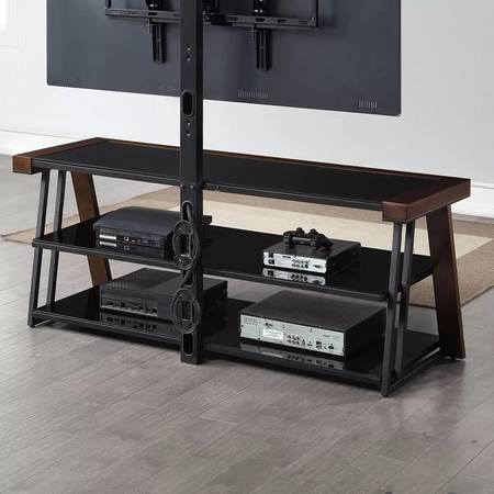 Your flat screen TV (up to 65 in.) has found a home. The Harlowe 3-in-1 stand keeps all your entertainment gear in one convenient place, with an expansive shelf for your TV and two more shelves for consoles, remotes, etc. The sturdy steel frame, composite wood construction, and tempered glass shelves provide a solid foundation and include a hidden cable organizer in the back.