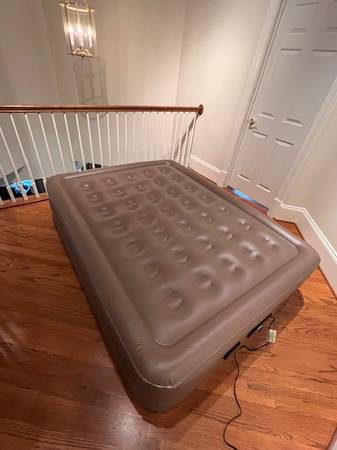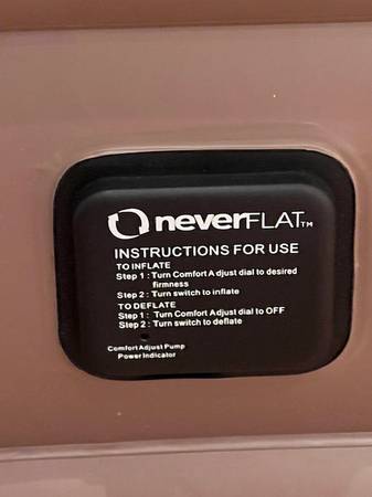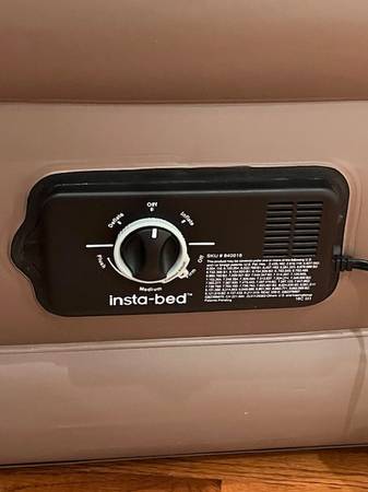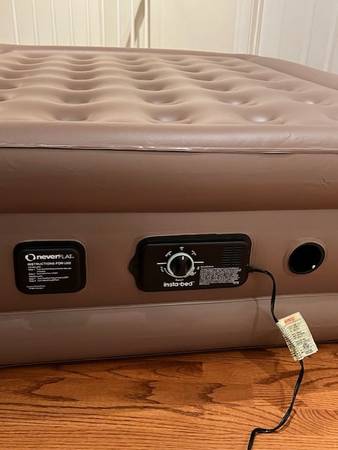 Insta-bed never-flat raised queen mattress. Built in self-inflation, deflation and never flat system. Includes drawstring storage bag.