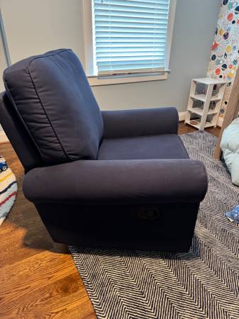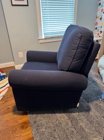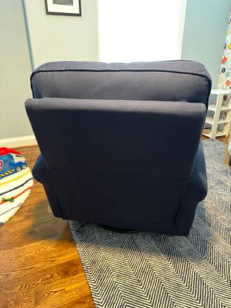 Navy blue pottery barn kids swivel glider rocker/recliner chair. Purchased for nursery, lightly used, has been in my son’s room covered in stuffed animals for several years. In great condition, selling because we are redecorating. Original owner. Pet-free, smoke-free home.