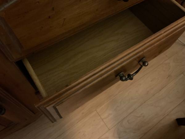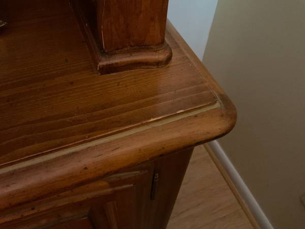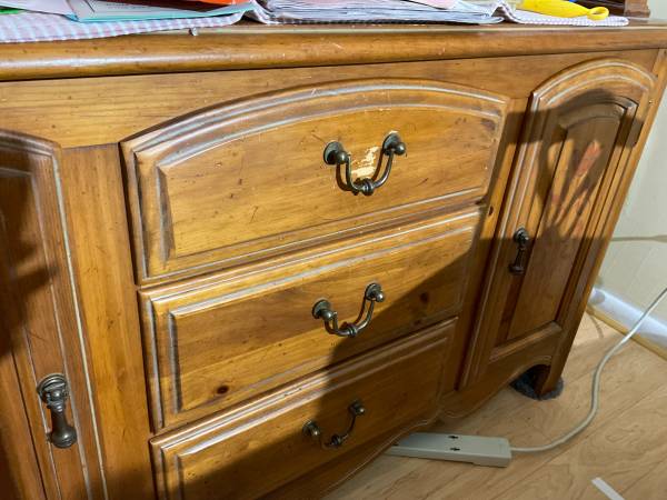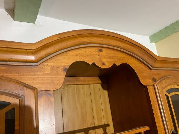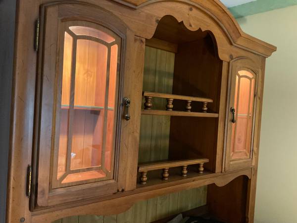 Vintage, solid wood hutch with working cabinet lights. This 2-piece buffet hutch offers loads of storage space for your serving and entertainment supplies or what not. Pennsylvania Dutch motif on cabinet doors. Features pendulum door pulls, glass shelves and glass cabinet doors, plate rail groove on buffet and on open shelves. A great display for your decorative pieces. This Broyhill piece has served two generations but due to senior downsizing it needs a new home. Could be refinished for a new look.