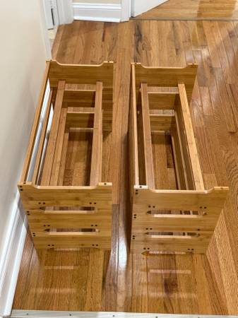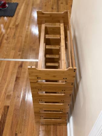 These beautiful shoe racks are new and sturdy. They’re made of bamboo and fit perfectly on top of one another. Each rack is 28.75” wide, 12” deep, and 5.5” high. You must buy all 6 racks. These come...