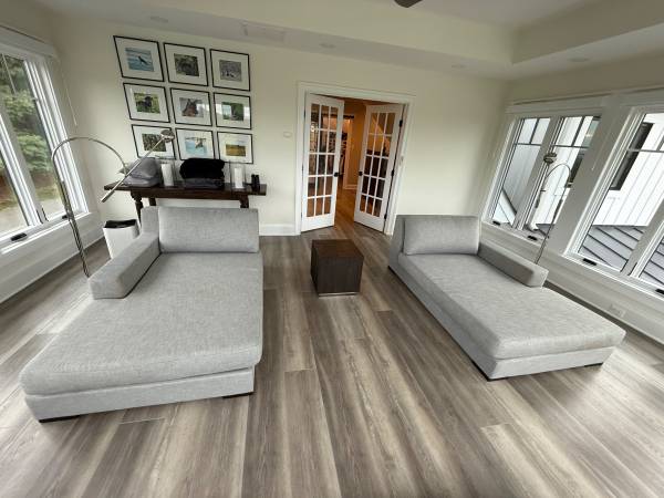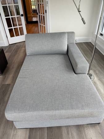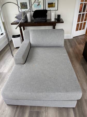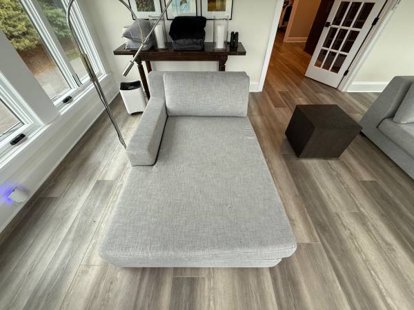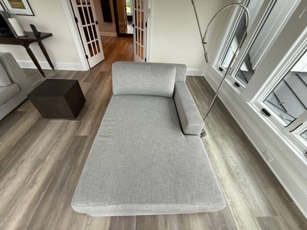 Up for sale is a pair of Restoration Hardware Modena Track Arm Chaises (one Left-Arm and one Right-Arm), upholstered in Italian Basket Weave Fog. These pieces were originally purchased for $4,100 each (total $8,200) and are approximately five years old. They are in excellent structural condition and remain very comfortable.
