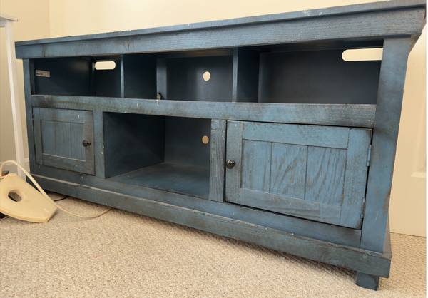This TV stand needs a little TLC. But the bones are great. It’s made out of wood and it was stained originally when I bought it this pretty bluish turquoise color. Maybe another artist could love it the way I did. That’s why there’s drips and drops of paint on it.. with a little bit of ingenuity or spray paint you could make this look lovely. The price is FREE
