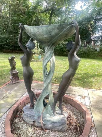 Outdoor furniture and décor-stunning huge copper art deco style fountain, weather veins, cupulas, outdoor stone, wrought iron and ceramic pots, planters, and figures, vintage Russel Woodard spun fiberglass table and chairs, vintage Russel Woodard wrought iron chairs, wrought iron tea cart and chairs, many wicker pieces, live plants, Italian Kartell bubble resin outdoor club chairs and Kartell Prince Aha stools, cast iron decorative sled, weathered metal pieces, decorative bird houses, 3 painted cast iron flamingos, beautiful pair of large copper cranes, copper pig roof décor, ceramic garden stools, 4 white porch rockers, 2 large resin panther statues, plant stands