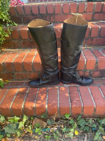 Black leather field boots with lacing at ankle for easy-on/easy-off. Amazonas Size 8 Non-smoking home. #fieldboots #dressboots #dressageboots #tallboots #grandprix #eventing