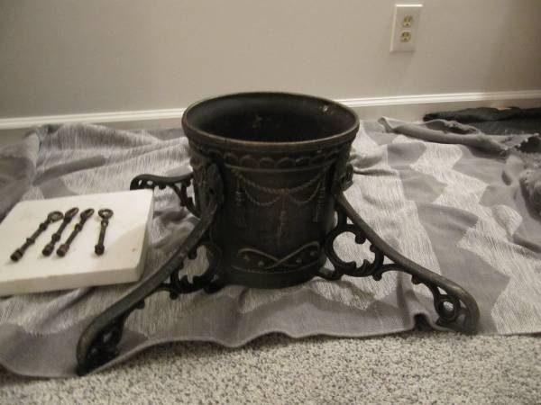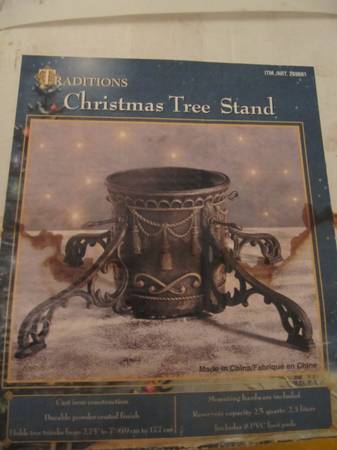 Victorian-style, decorative, cast iron, large Christmas tree stand. 10.5x10.75x13. Weighs 26.9 lbs. and has a reservoir capacity of 2.5 quarts. Legs removable for storage - has hardware and box.