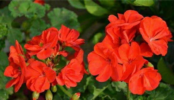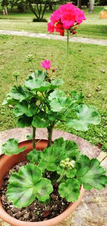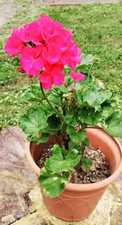 Pelargonium hortorum, bloom year-round and are very easy to grow. $3 per plant (not per pot; some pots have one plant, others have 2-3). Cash only, thank you.