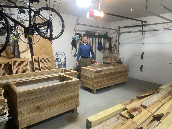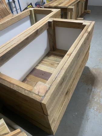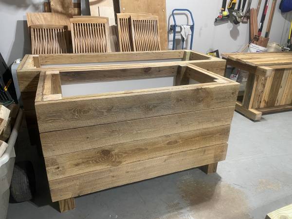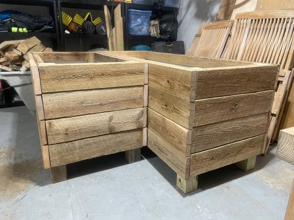 Custom made planters made out of reclaimed wood and lined with aluminum. Dimensions of ones in photo are 2’ by 4’ by 2’ deep by 29” tall (with legs) and 2’ by 6’ by 2’ deep by 29” tall (with legs).