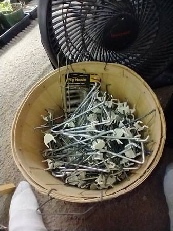 I have a bushel basket containing an assortment of peg hooks and peg shelf brackets for sale. They were used on peg board to display merchandise at flea markets. I am asking $25.00 cash for the...