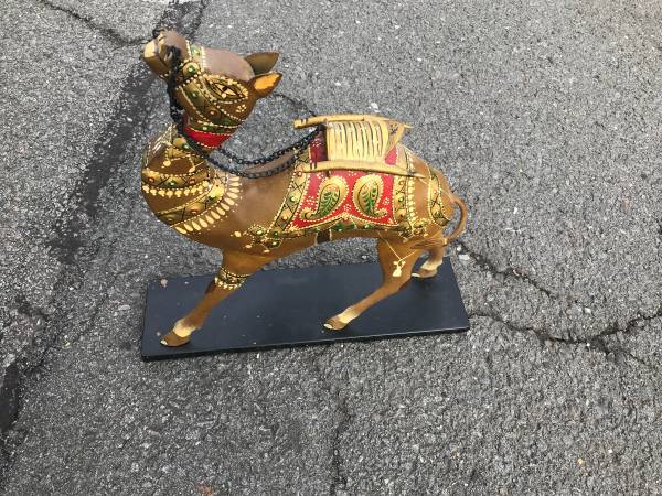 Bring a touch of global elegance to your space with this vintage hand-painted metal camel sculpture from Pier 1 Imports, crafted in the 1990s. Standing at 16 inches tall, this beautifully detailed piece showcases traditional Indian craftsmanship, complete with intricate painted textiles and ornamental harness accents.