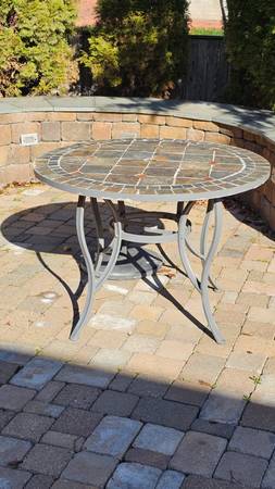 Round mosaic top with metal legs, perfect for garden or patio. $50 or best offer. 3'4" diameter