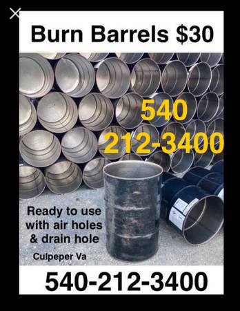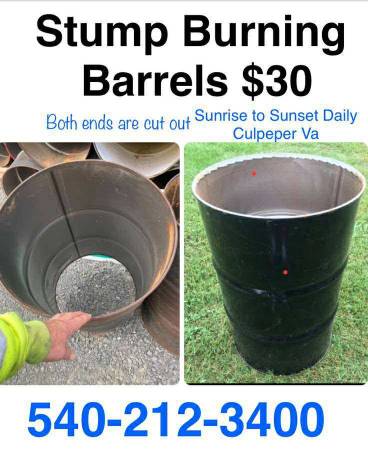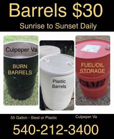 55 gallon metal barrels with the top or cut out with air holes and a drain hole ready to be used as burn barrels for $30 each, stump burning barrels with both ends already cut out $30 each, solid top barrels to be used as fuel storage $30 each. Plastic barrels with solid top for $30 each. Sunrise to sunset daily. Culpeper Va