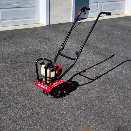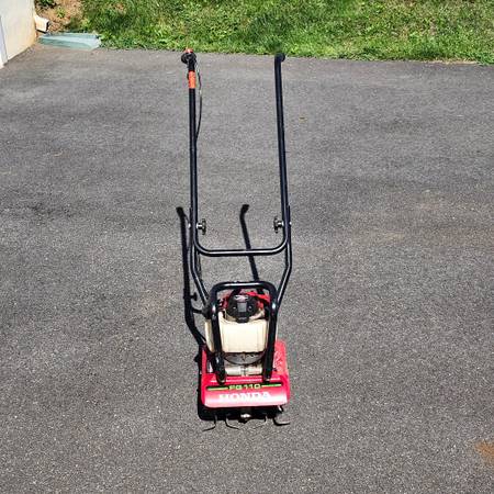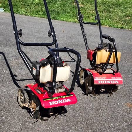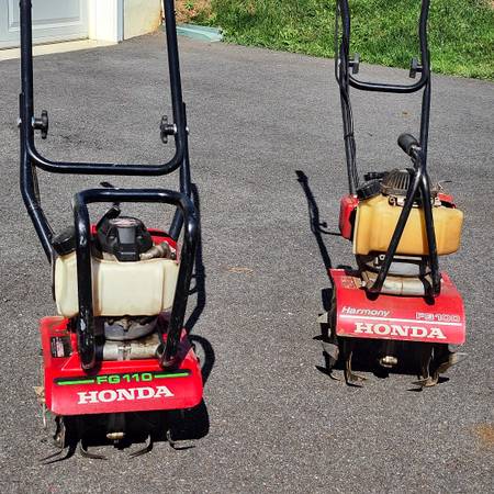 Like New Honda FG110 small Garden Tiller. Only burned Non-Alcohol Gas. Gas drained after each use. Cleaned after each use. Always stored indoors. Comes with Honda Harmony FG 100 for back-up parts...