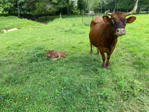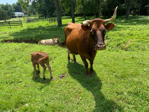 Mom is a Dexter/Jersey cow born 2016. Successfully calved 7 times. Has been milked before. Only has two working quarters. Heifer born July 26th. (3/4s Jersey). Polled