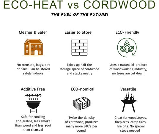 No additives, food safe, VERY low ash, HIGH heat, LOW smoke, EZ to use heat source.