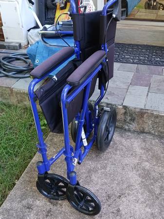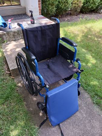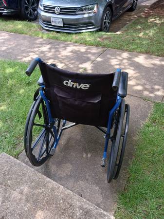 Drive brand wheelchair. Has dual adjustable leg/footrests. Includes optional memory foam seat cushion. Folds for easier transport or storage. 250lb weight capacity.
