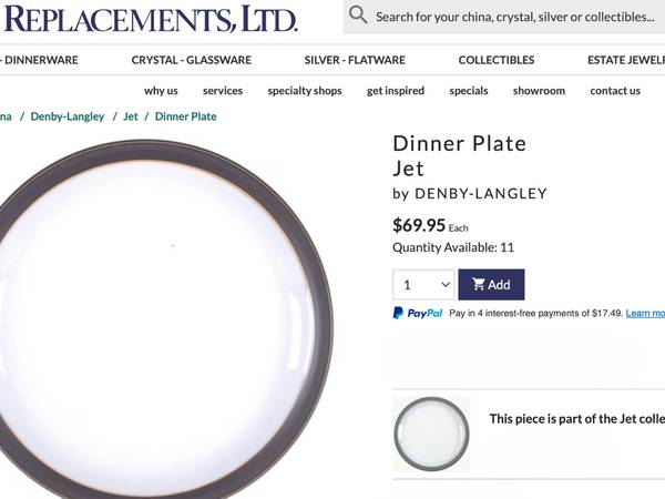 Renown & handcrafting in England. This discontinued Denby “Jet" Iconic stoneware set is dishwasher, microwave, freezer and oven-safe. Each dish goes for $69.95 a piece from "Replacements,LTD”+.