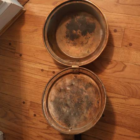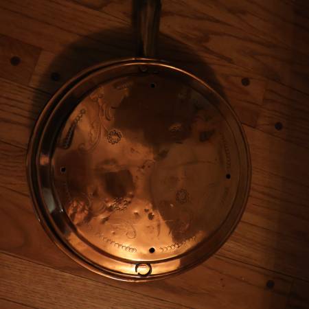 This is one impressive piece … extremely heavy copper lidded “pan” set on a long wooden shaft. The hinge is still in good working condition. Dimensions: length – just under 3 ½” feet and width of the pan – 12”/1 foot and depth of pan – 3 ¼”.
