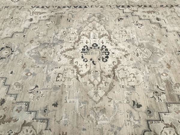 Beautiful Large Medallion Rug in Neutral Colors of Cream, Beige and Grays. The design beautifully provides a luxurious but comfortable and warm look to your room and furnishings.