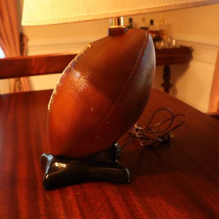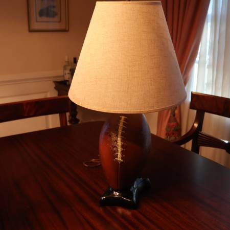 Great for a football fan or player, child or adult. Glass football on a black base. On/off switch and textured lampshade. Brass harp and finial. Tested and it works. Dimensions: height – 24” and width (of the ball) – 6”; lampshade is 11” high and 14” across.