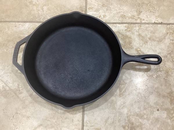 A good condition Lodge Cast Iron 10SK, 12” Pan with double handle, 2 pour spout.
