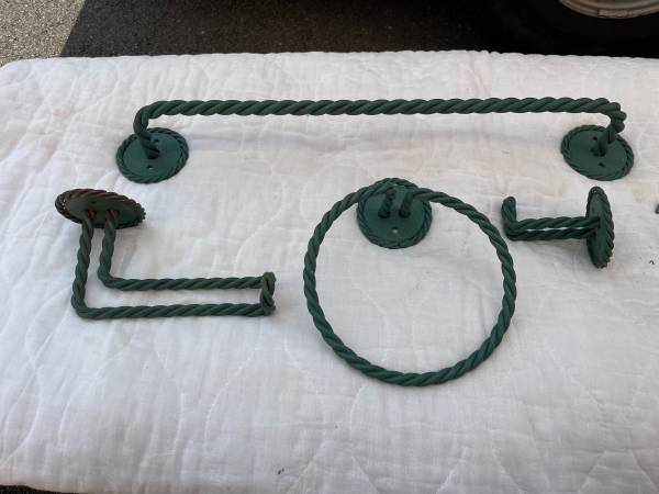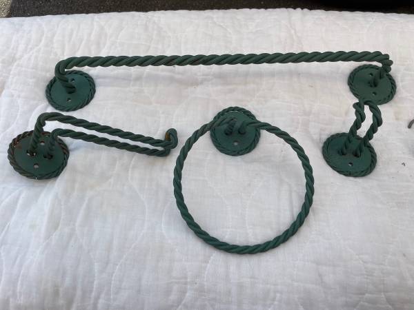 Bathroom hardware set, 18” towel bar, toilet paper holder, towel hook, 6” round hand towel holder, 12 leaf shower curtain holders, can be repainted to match your decor. $ 25.00 cash