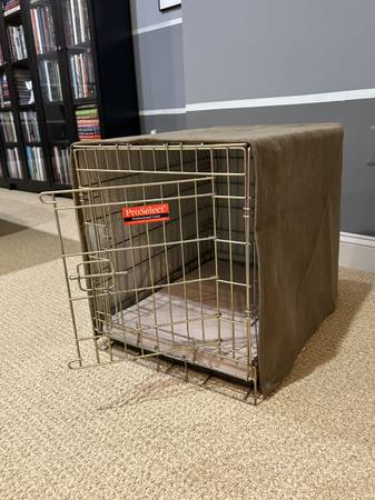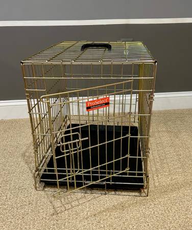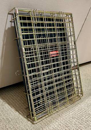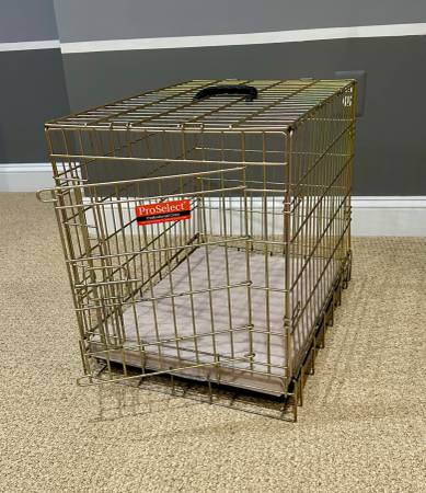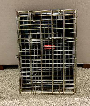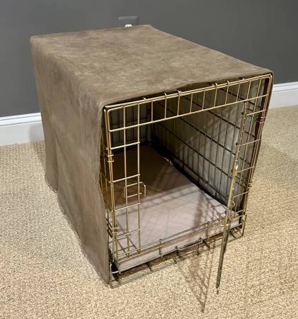 Measures 24" L x 16" W x 20" H Includes: ~ Removable plastic floor tray for easy cleaning ~ Foam dog bed ~ Brown fabric cover Folds for easy storage. CASH ONLY!