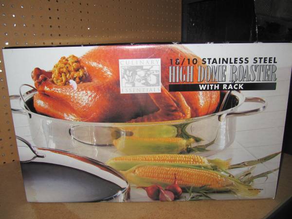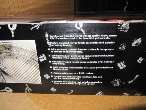 Heavy-duty high quality Stainless steel. Stick resistant/can accommodate a 25lb. turkey. Elevated steel rack can be used to lift turkey. Professional quality.