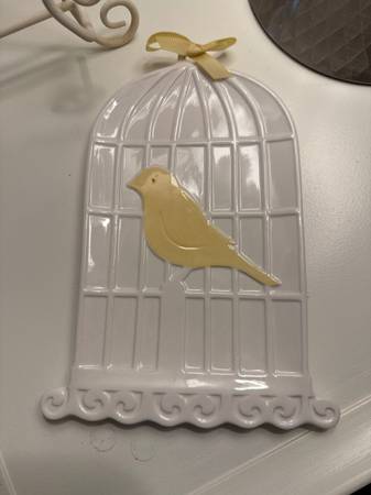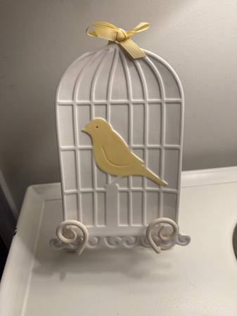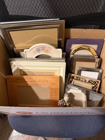 Box with collection of picture frames (hallmark and other quality brands), votive candle set, precious moment figurine, bird cage decor (used a a jewelry dish). All for $10 for pick up today.