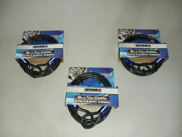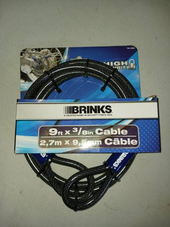 I have (3) brand new in the original packaging Brinks High Security Flexible Steel Cable 9 ft x 3/8 in. Great to lock up bicycle(s), motorcycle(s), scooter(s), ATV(s), UTV(s), Sidexside(s), trailer(s) anything you can put a cable through. Padlock not included. $10.00 each.
