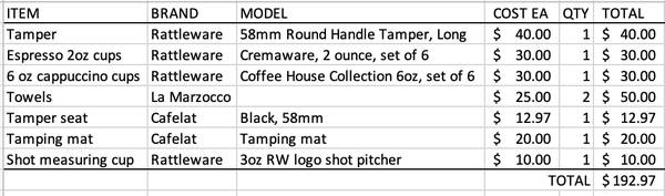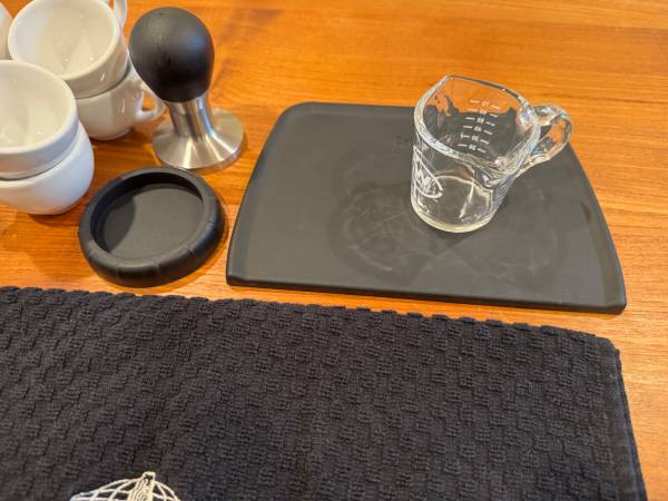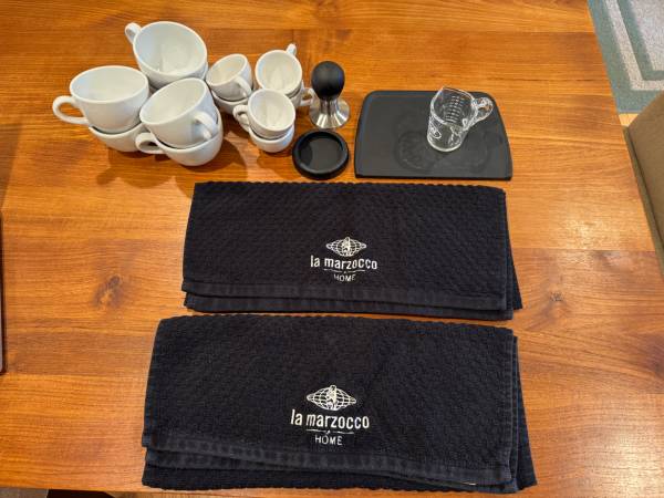 This includes a 58mm tamper, tamper seat, tamping mat, 3 oz espresso shot measuring glass, two La Marzocco towels, a set of six 6oz cappucino cups, and a set of six 2oz espresso shot cups. See the screenshot in the photos for more details. All items are lightly used but in excellent clean condition.