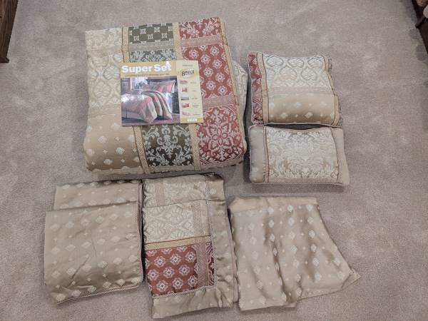 Elegant patchwork design bedding set. Includes: 1-Comforter, 2 Shams, 1-Bed Skirt, 2 Decorative Pillows, 2-Euro Shams Used only in our guest spare bedroom. Excellent Condition !!