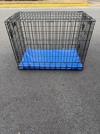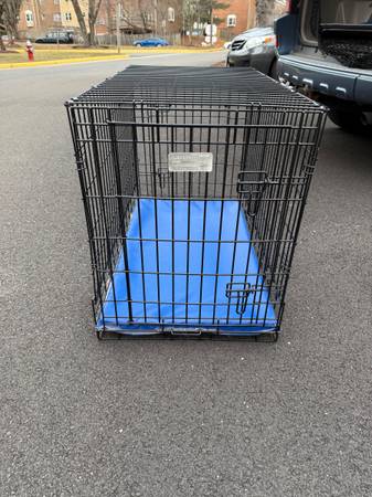 Two MidWest Solutions Series Side-by-Side Double Door Collapsible SUV Dog Crates. Dimensions are: 36” long x 21” wide x 26” high. Weight is 38 lbs. per crate. Recommended pet weight is “up to 70 lbs.” The crates were purchased in November 2021 and have been used to transport Siberian Huskies. PLEASE NOTE: In December 2024 my vehicle was rear-ended; the crates look and close just fine; however, I was unable to collapse them. A friend did collapse one of the crates; perhaps someone with tools (or strength) will be able to collapse the second one. The crates are otherwise in excellent condition and have doors at each end. The crates are coated metal (black). The blue crate pad in the photos is NOT included with the crate; only the removable plastic liner comes with the crate. Price per crate on Chewy is $72.00; this offer is for two crates for $80.00 or $40.00 each. CASH only.