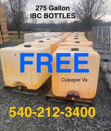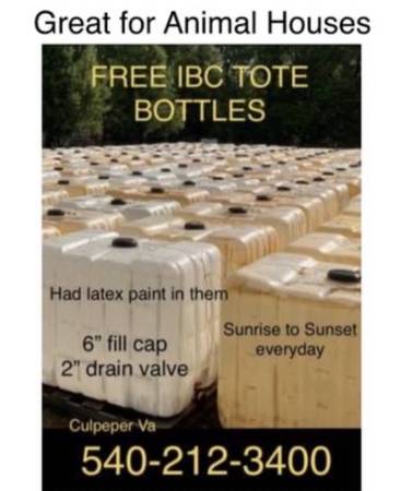 I have 275 gallon IBC tote bottles that had water soluble latex paint in them FOR FREE. These are for the bottles only and do not include the metal cages. They are roughly 40 inches wide, 48 inches deep, and 48 inches tall. Some of them still have residual wet paint in them and some of them have the paint already dried up in chunks. You can wash them out or leave them open to let the paint dry up. Great for making goat, pig, and sheep sheds, dog pens, chicken coop,calf hut, water the garden, etc. You can cut the out and fill them with dirt, stone, or concrete and use them for erosion control or retaining walls. Cut them up and use the panels to make buildings, roofing, and siding., or barriers. The possibilities are endless. I also sell IBC cages and complete IBC totes. I’m usually available seven days a week from sunrise to sunset. I am just 3 miles off route 29 in Culpeper VA 22701. Please call or text for easy directions. 54zero@212@340zero