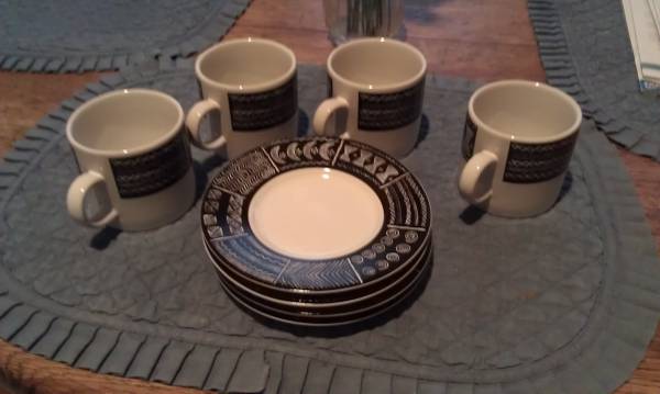 Are you an avid coffee drinker who is in the market for a beautiful espresso / cappuccino cup and saucer set? Well, I may have what you're looking for. I'm selling a stoneware Sakura Batik Espresso / Cappucino cup and saucer set, service for four, for only $10.