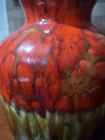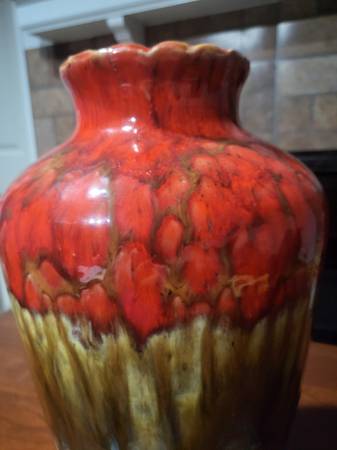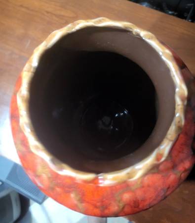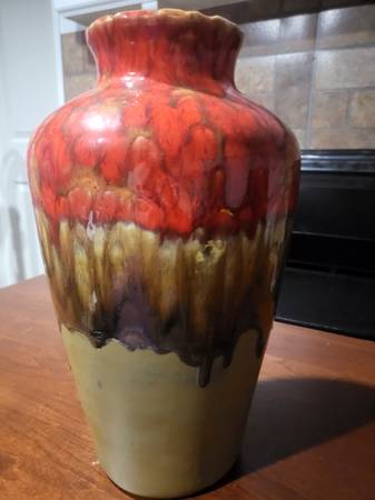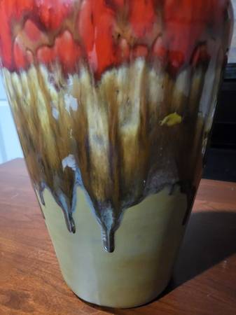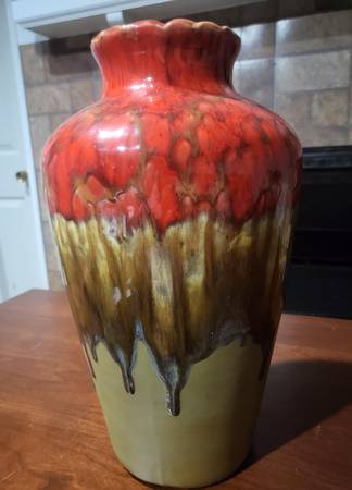 Beautiful hand made drip glaze vase with red and brown colors dripping and glazed over a light tan vase. Bottom says SH 10. Excellent condition, no chips, cracks.
