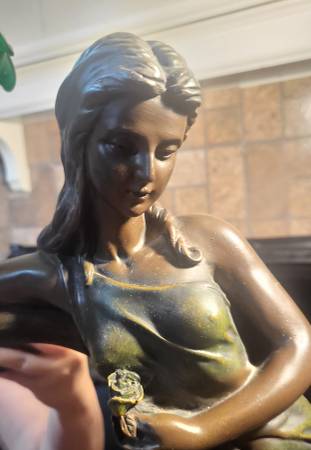 Beautiful vintage Art Nouveau Tiffany-style lily shade vanity mirror table lamp featuring a lamp stand sculpture of a woman embracing a large vanity mirror with roses going up the side of the mirror which extends to a lily-shaped Tiffany Style lily shaped glass lamp shade, a child is at the bottom of the lamp stand holding onto the woman's leg.