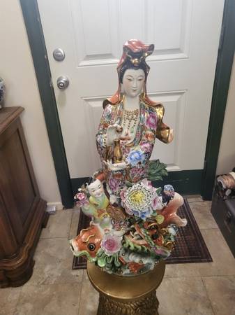 Huge hand painted statue of Chinese Goddess Guanyin, the Goddess of Compassion and Mercy, accompanied by her assistants, the young boy Chancaï and the young girl Longnü in a floral decoration. 27" height x 17" length. Beautiful details and colors throughout the statue. It is so huge that it will be noticed right away when walking into the room.