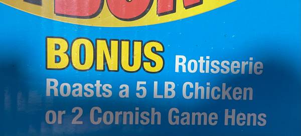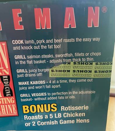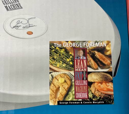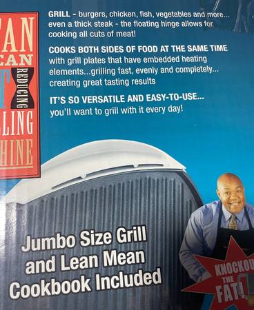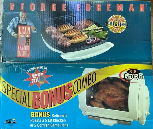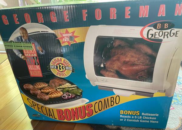 Still factory sealed, never used but stored for a number of years. Large box with Jumbo George Foreman grill and a separate rotisserie.