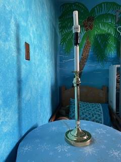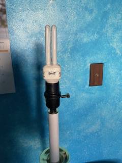 28 inches tall with bulb, base is 6 inches in diameter, comes with working light bulb