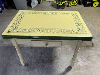 Beautiful enamel painted vintage table with two working pull out leaves and a drawer. It is hardwood, and features the copywrite mark "Mochi" on in. Works well. Dimensions are 40" wide, 31" tall,...