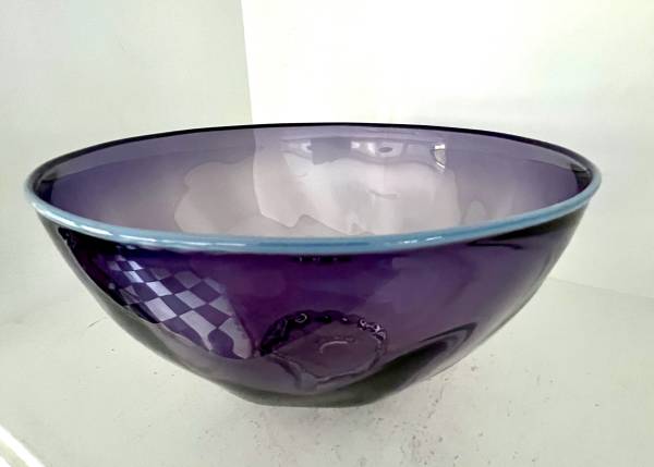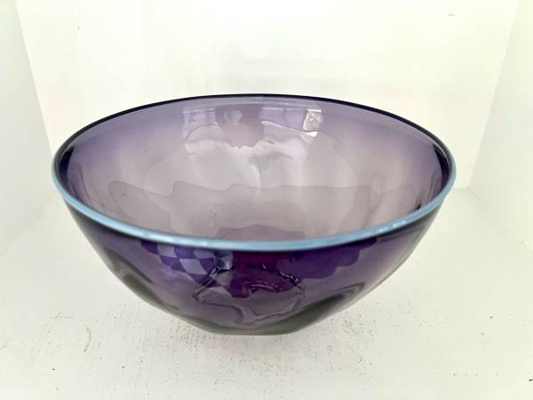 Gorgeous hand crafted and marked bowl in a beautiful purple shade, a clear footed base, and a light blue rim trim finish No scratches or repairs - displayed only - in like new condition Measure 9”...