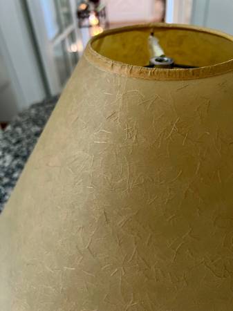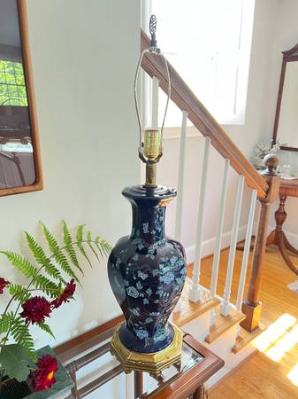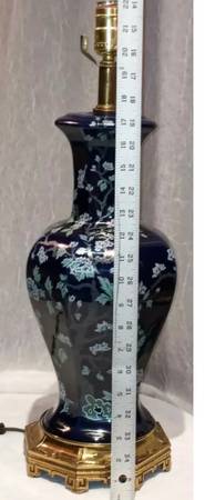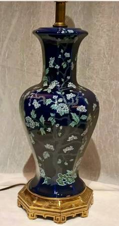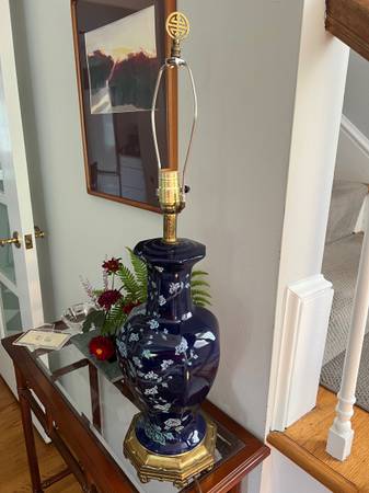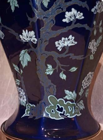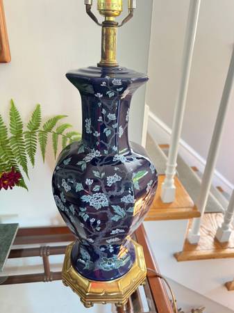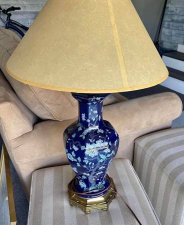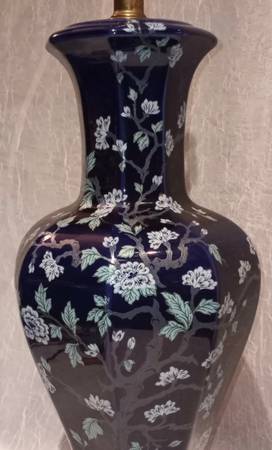 Mid-Century Modern Ceramic Colbalt Blue 3-Way Switch Lamp With Hand Painted Cherry Blossom Tree With Flowers. In very good gently used condition No chips or cracks. The shade shown comes with the lamp - it’s a rustic oiled parchment shade in wonderful condition; yet, I believe the lamp may look even better with another shade .