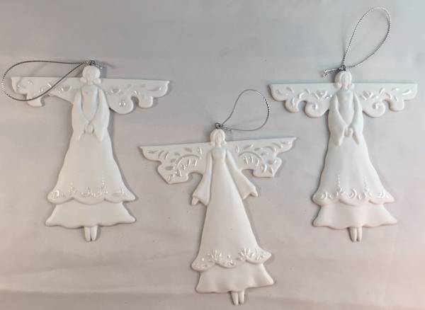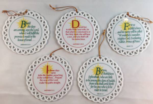 Five round porcelain-ceramic Christmas tree ornaments with Bible verses on both sides, and three ceramic angels. From a smoke and pet free home.