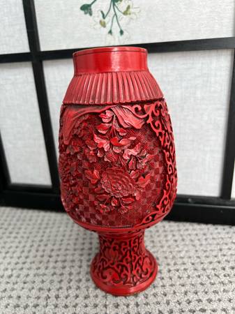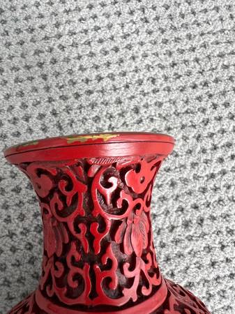 This beautiful vase is hand carved and intricately made. It has a brass liner and is in good condition. There is a minor chip on the base ( see last picture with grey arrow) but no serious damage noted. The lacquer is in great condition.