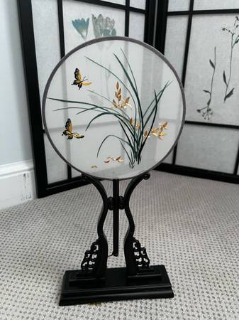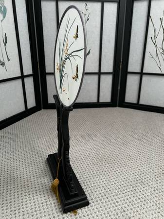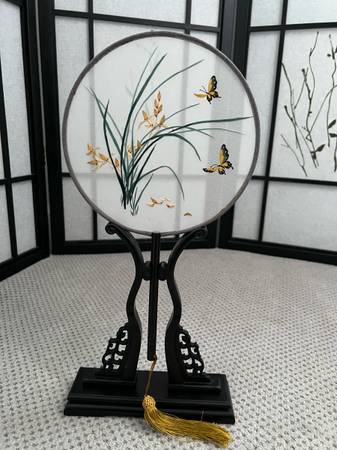 This high-quality fan features double-sided embroidery and sits on an elegant wood stand Embroidery products are a folk art tradition in Suzhou, Jiangsu Province, China Suzhou embroidery works are...