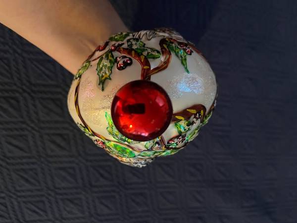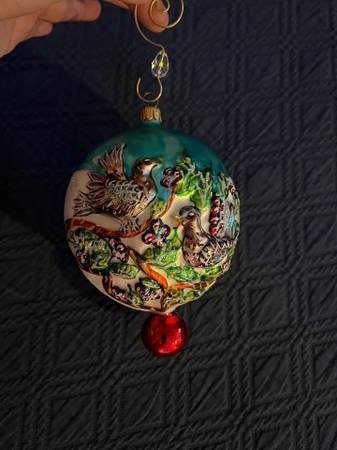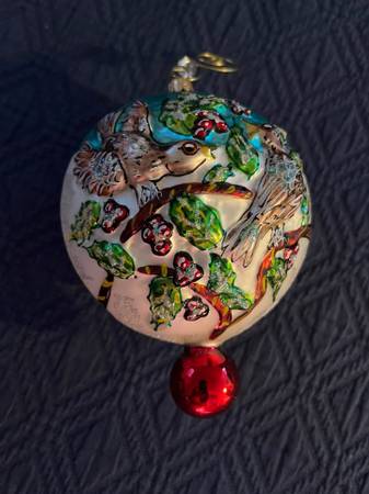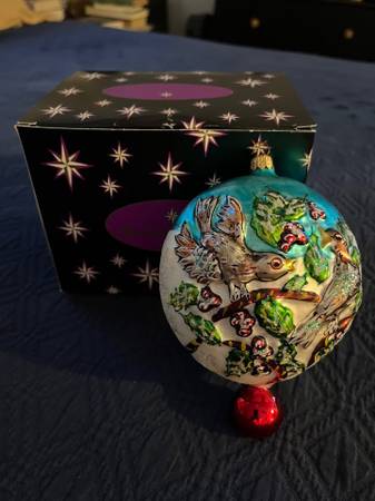 A lovely piece by Christopher Radko, a part of the Twelve Days of Christmas set. Comes with ornament, decorative hook and a Radko box, although NOT the original one with the name of "Four Calling Birds" written on it. This ornament is still in wonderful condition, but it has been hung and no longer has its tags. From a smoke-free home. Pick up in Pimmit Hills near Tysons Corner, or will ship to you.